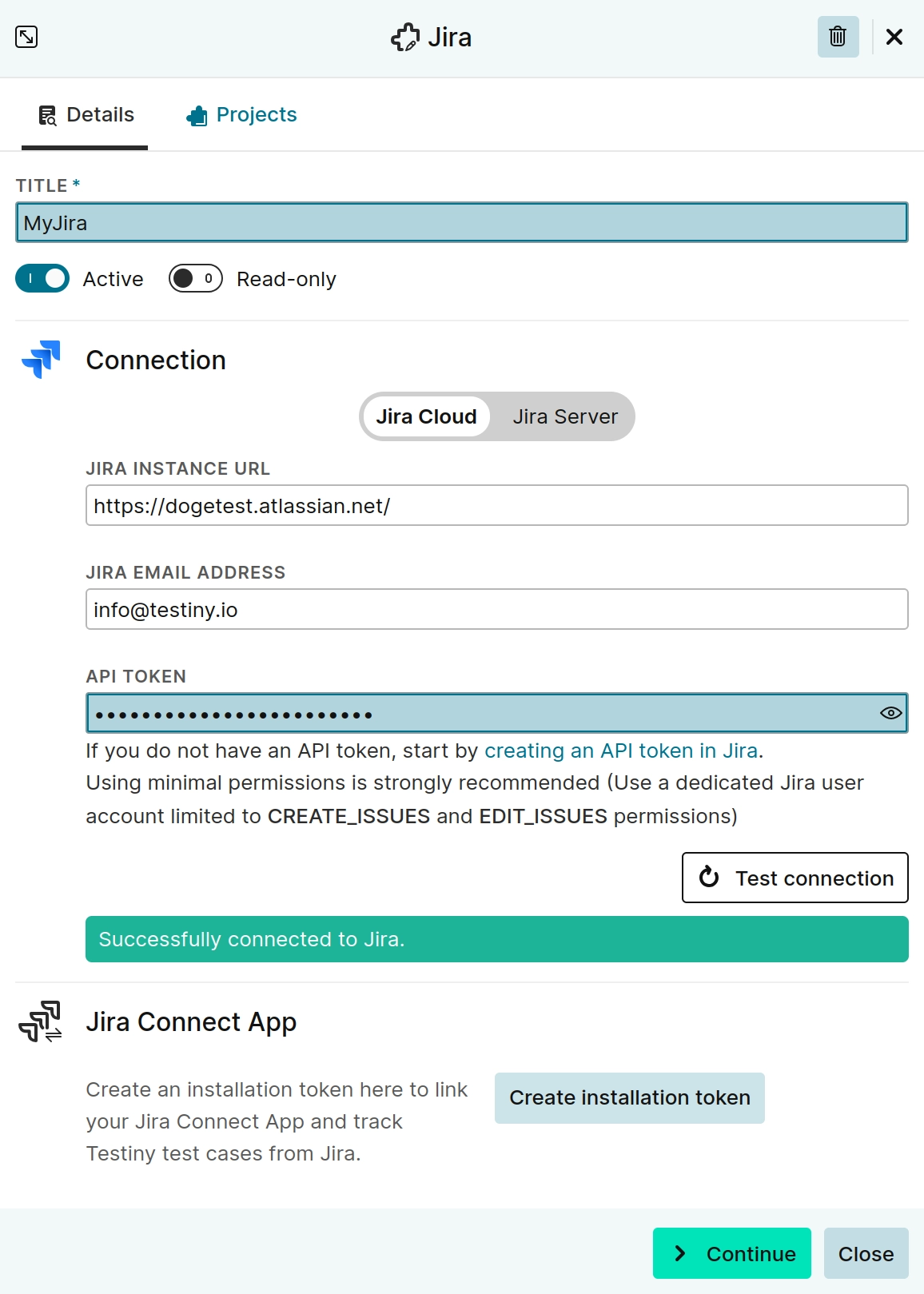 When you add a new integration or edit an existing one, a side panel opens with two tabs, "Details" and "Projects". This view can look slightly different for each tool.The screenshots below show an example of a Jira Cloud integration.