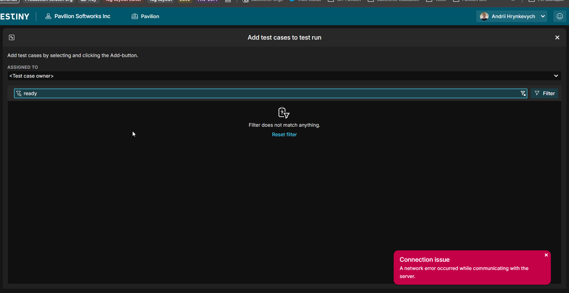 This error can happen if the connection to the Testiny servers fail.