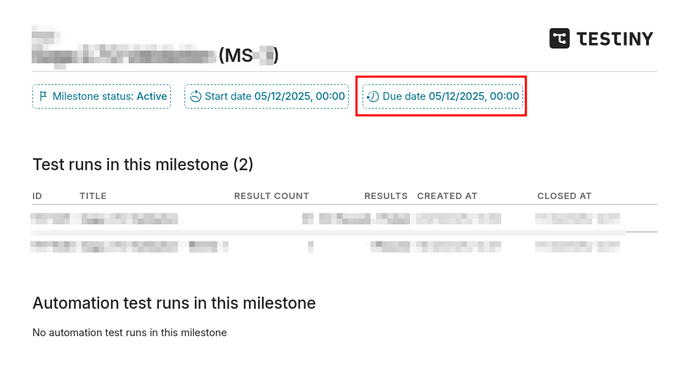 I just generated a pair of reports for a milestone, and both of them are showing the incorrect date/time for the due date. Instead of the actual due date as set in Testiny, they are instead showing the start date. The actual due date for this milestone was 2025-12-17T17:00.