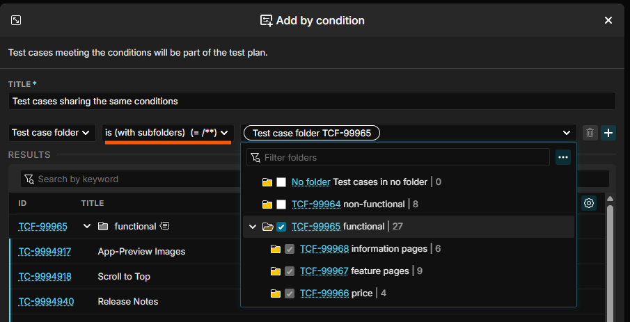 When I would like to use “Test Case Folder is …” condition to create a test plan, I have to go through all the nested folders and select them one by one which is a bit not convenient. In case it would have been good to select all test cases under the top most folder (including the ones under the nested folders)